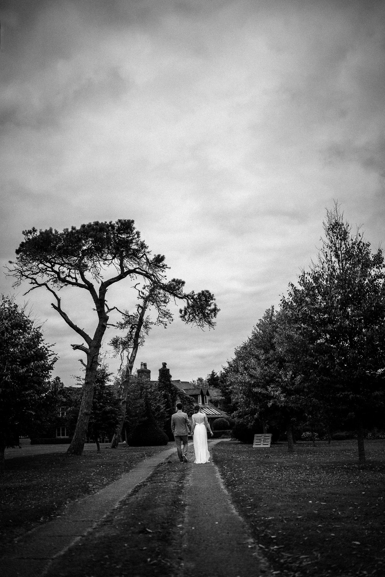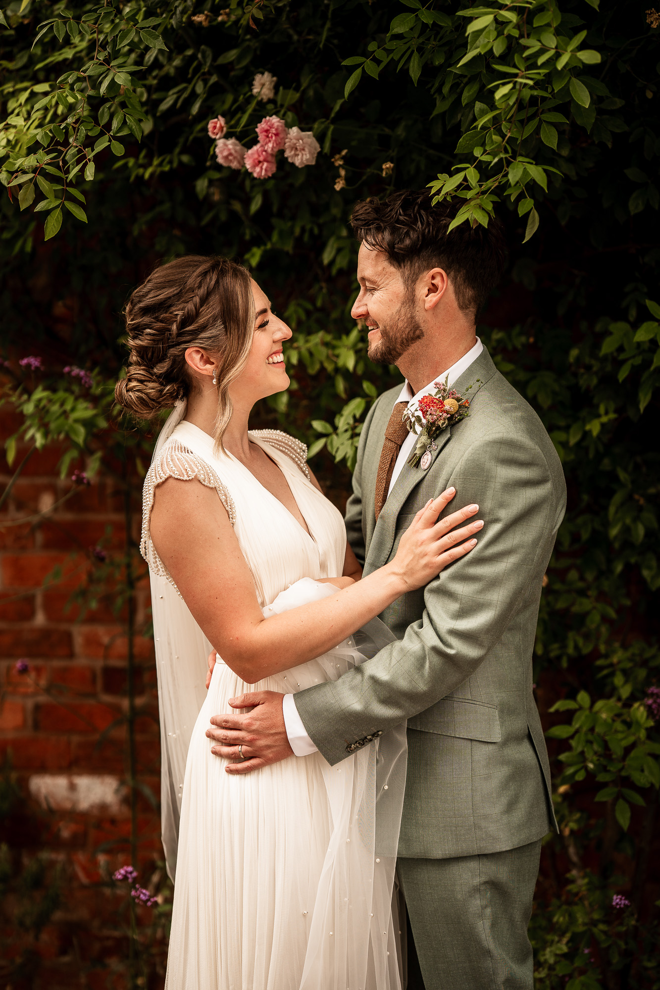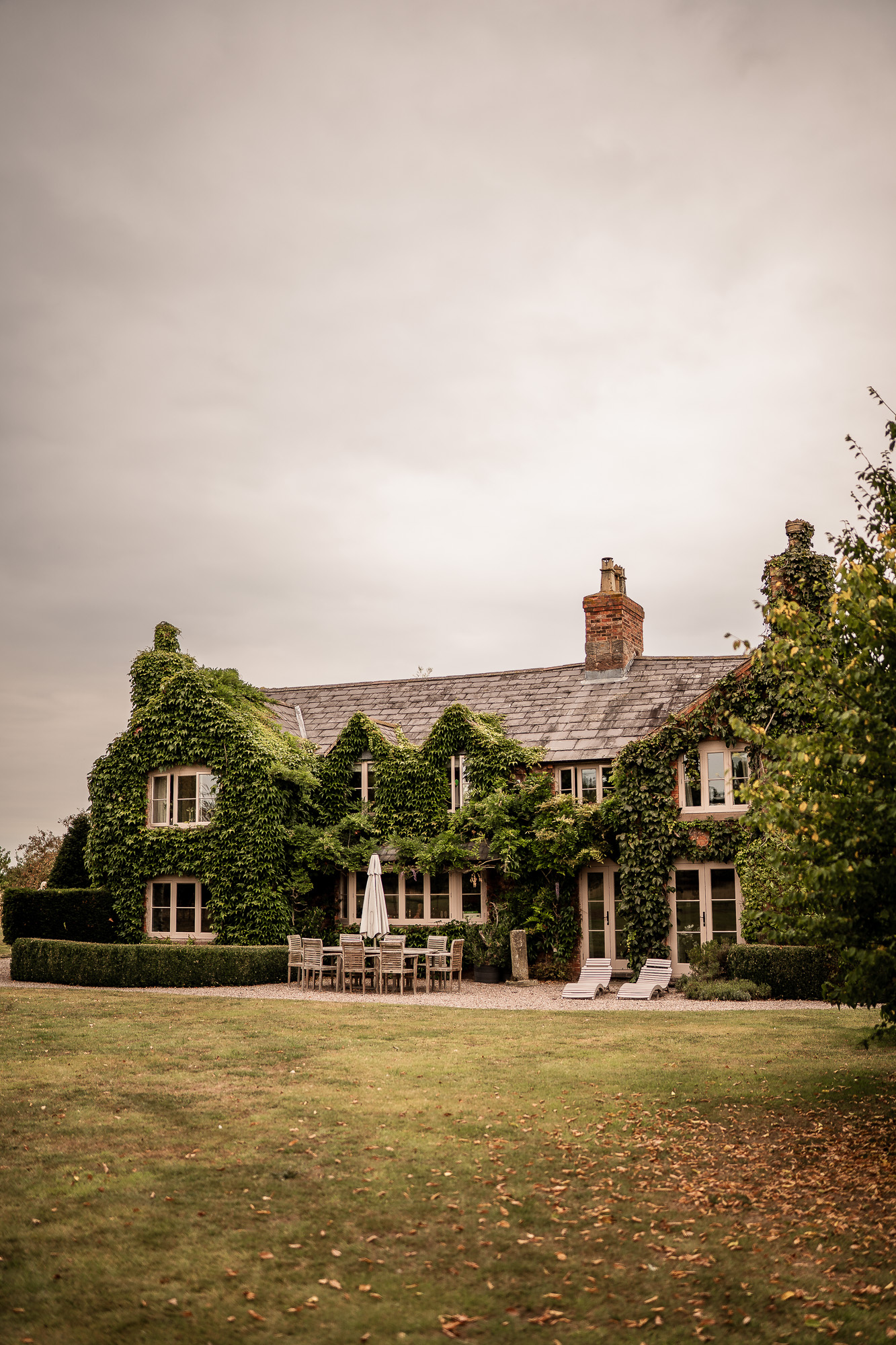 Once the formal photographs were complete, I took the newlyweds for a short walk around the estate for their couple portraits. I always keep this part relaxed and unobtrusive. No stiff posing, no lengthy interruptions, just gentle direction and space for them to be themselves. Whether framed by orchard trees, evergreen topiary or the historic brick of the manor, the goal is the same. To create natural, editorial-style portrait photographs that feel effortless, joyful and completely true to them.