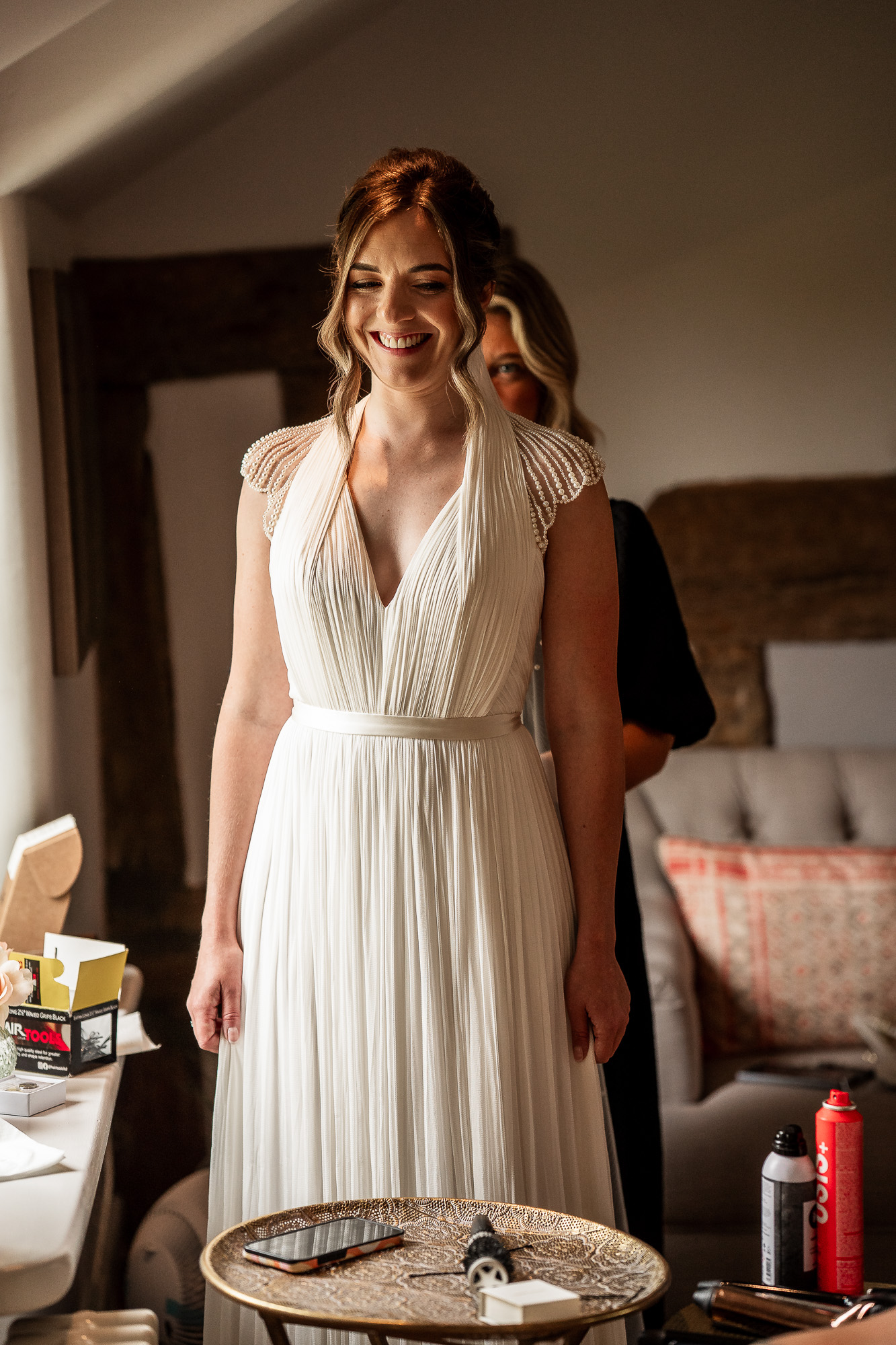 Morning preparations at Scarlet Hall unfold across the historic manor house and adjoining coach house, creating what I often describe as a true wedding venue experience. With elegant bedroom suites for overnight guests, deep inglenook fireplaces, and beautifully proportioned reception rooms, there is ample space for bridal preparations, groom prep, and those quiet in-between moments that make the start of a wedding day so meaningful. It is the perfect setting for relaxed, documentary wedding photography, where natural interactions take centre stage.