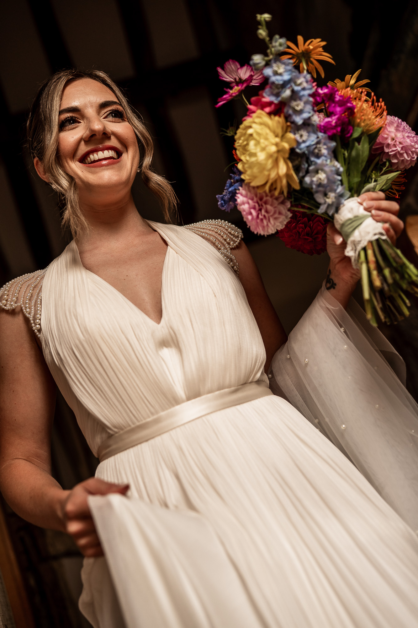 The light at Scarlet Hall is a gift to any Cheshire wedding photographer. Large period windows and softly toned interiors create beautiful window light that is flattering, consistent, and ideal for bridal portraits. As the dress is buttoned, the veil is placed, and the bouquet is lifted for the first time, the combination of soft natural light and historic textures allows for timeless, editorial-style images without the need for intrusive lighting setups.