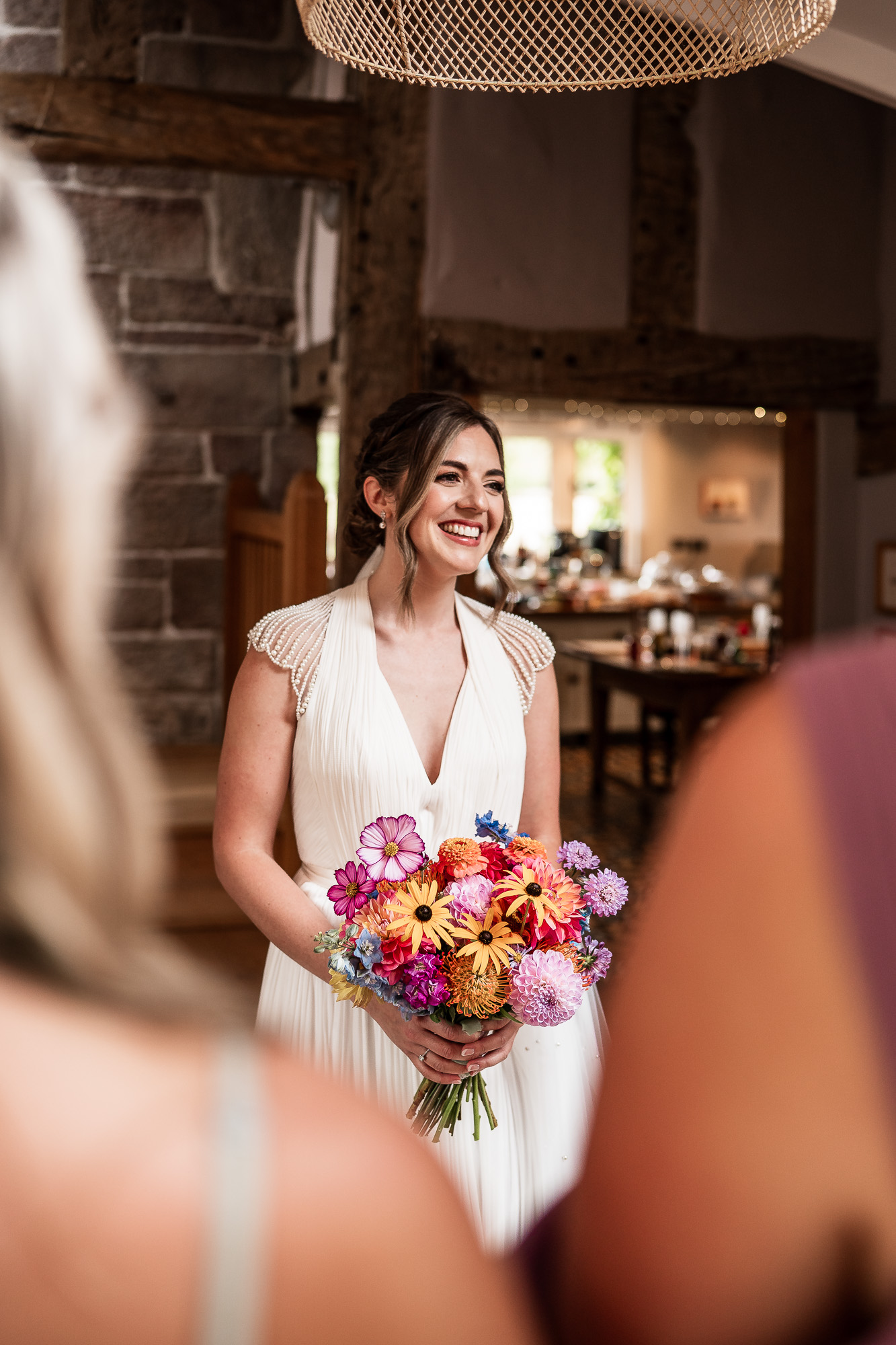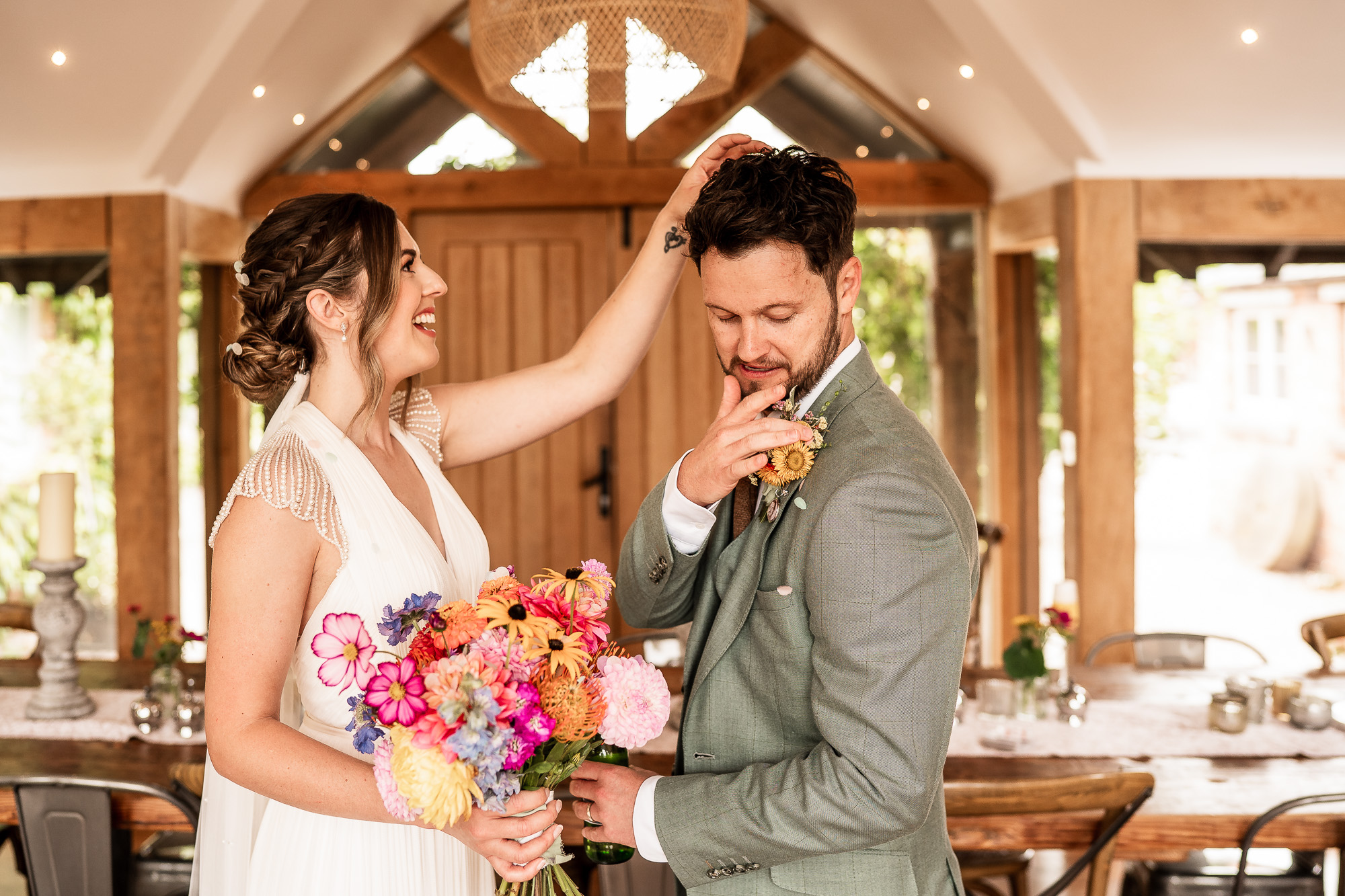 Then, as guests begin to gather for a civil ceremony or humanist ceremony onsite, the energy gently shifts. Bouquet in hand, a deep breath taken, the doors open onto sweeping Cheshire countryside or into the rustic barn beneath its canopy of fairy lights. And the next chapter of the wedding day at Scarlet Hall begins.