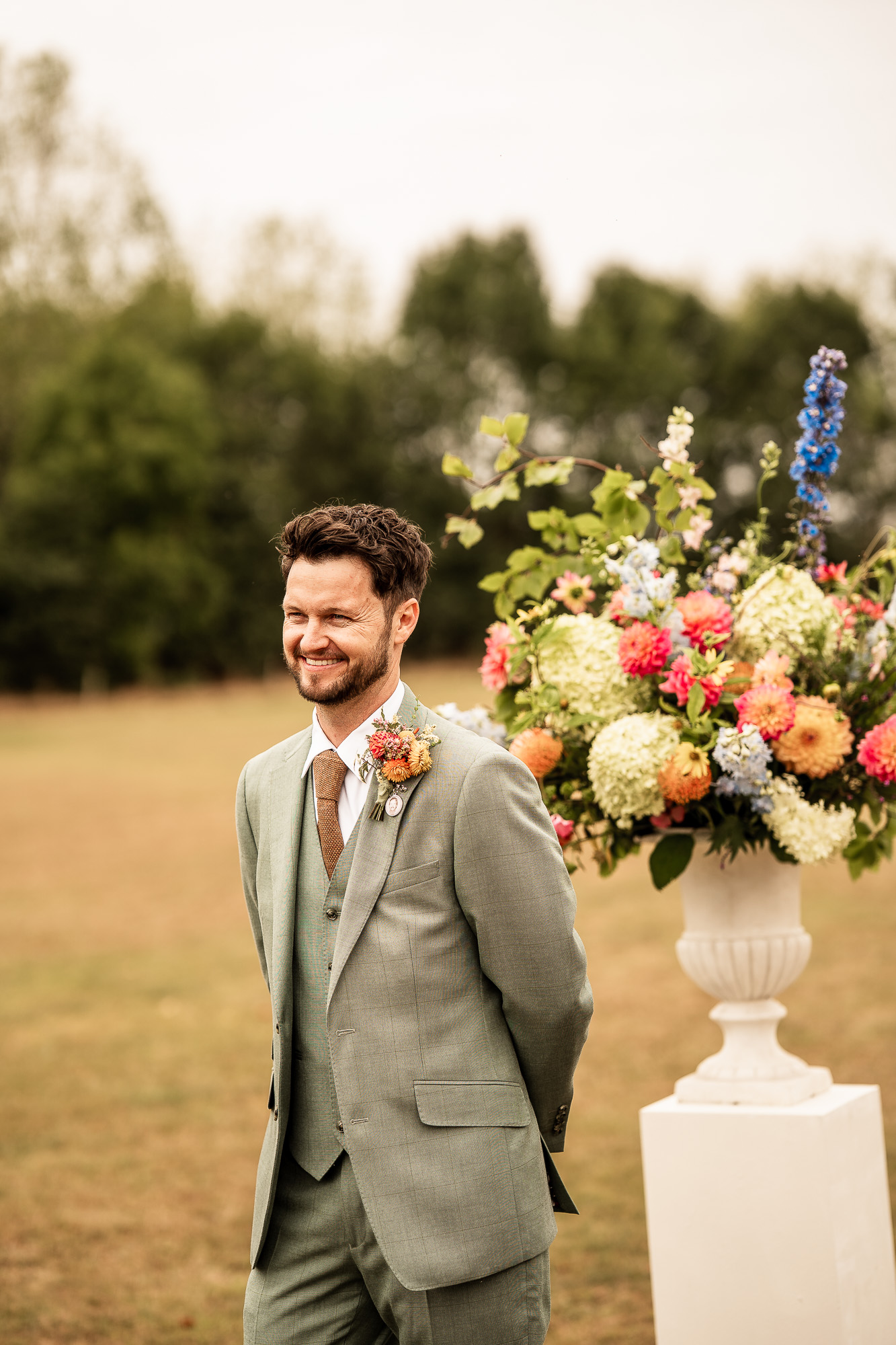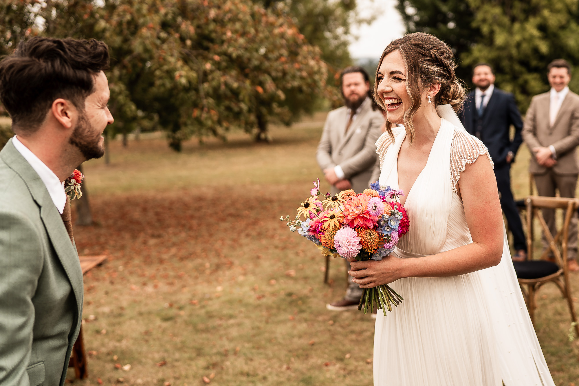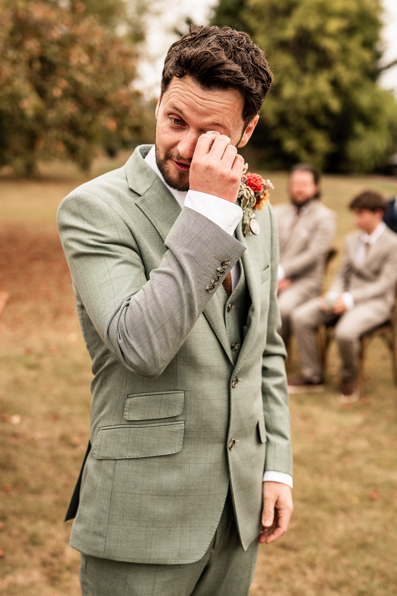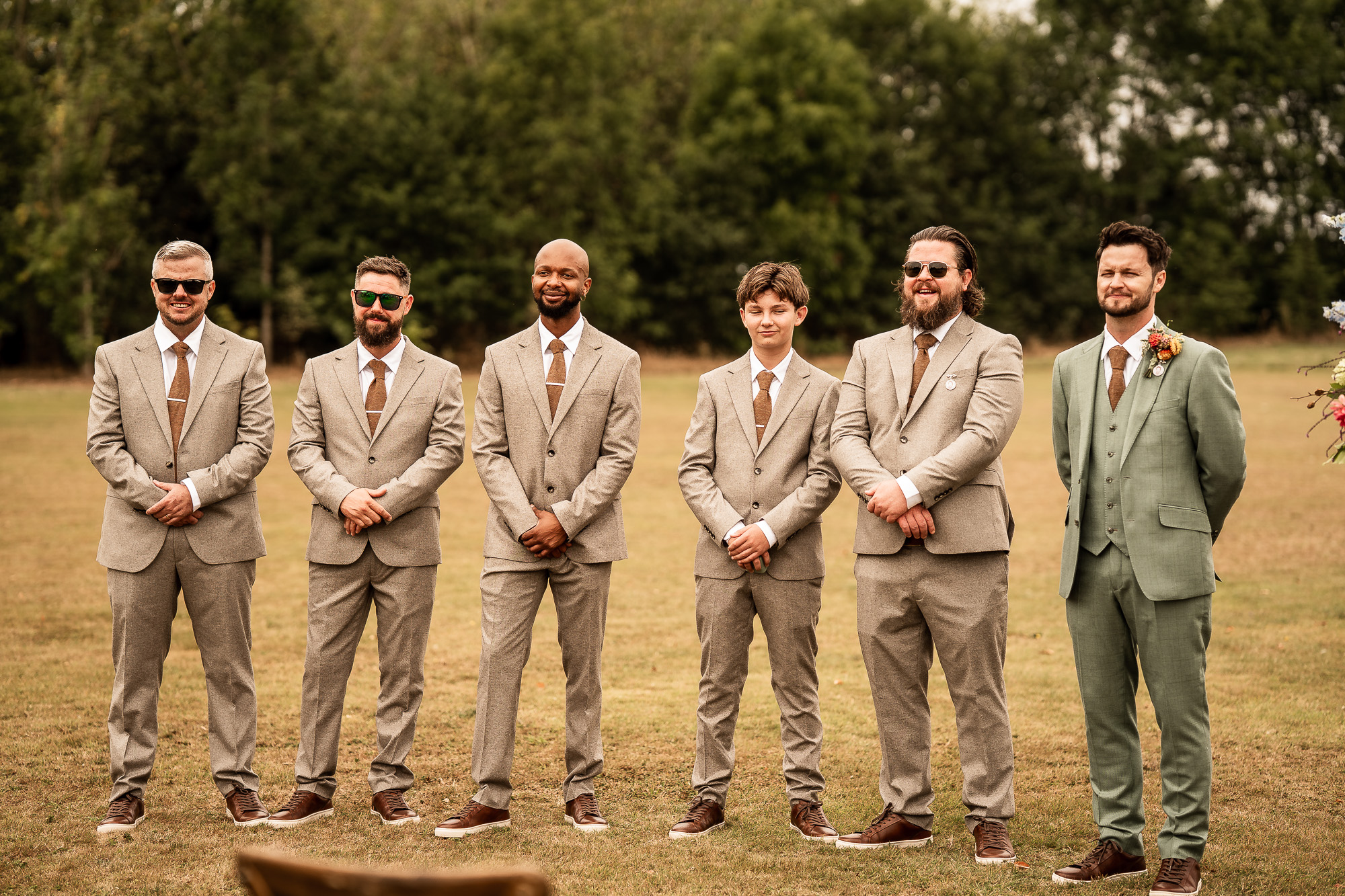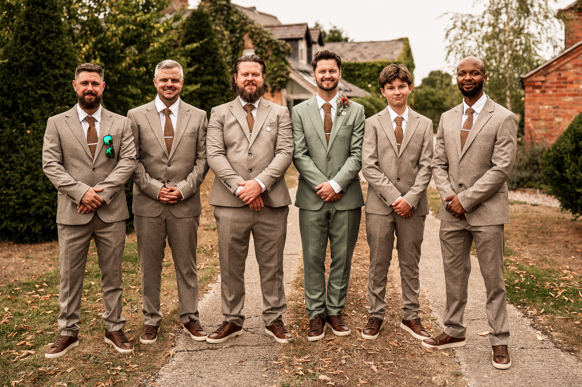 As the bridesmaids and the mother of the bride gathered on the lawn at Scarlet Hall, the groom and his groomsmen were already in excellent spirits, greeting guests against the backdrop of rolling Cheshire countryside. Jackets were straightened, buttonholes pinned into place, and those last quiet breaths taken before it was time to walk to the ceremony space and wait.