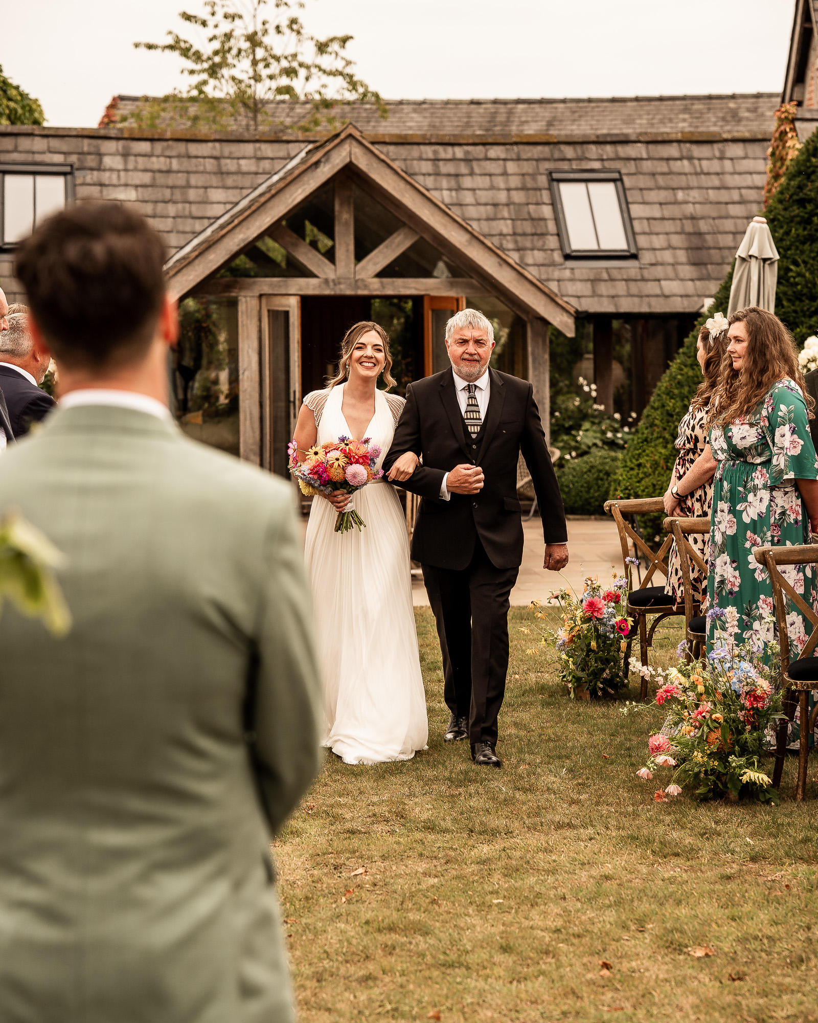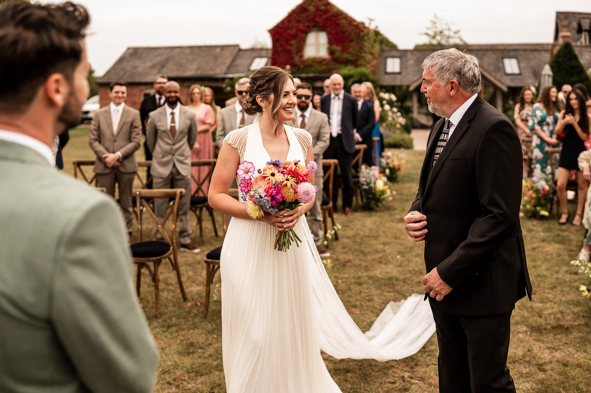 The bridesmaids made their way across the grass, dresses catching the breeze, gently building anticipation among the seated guests. Then the bride appeared, accompanied by a very proud father of the bride, walking towards the ceremony area with the manor house standing quietly behind them. The atmosphere was full of warmth and affection, the kind you can feel ripple through a crowd.