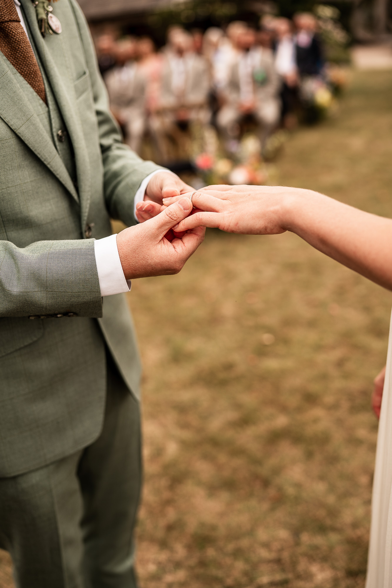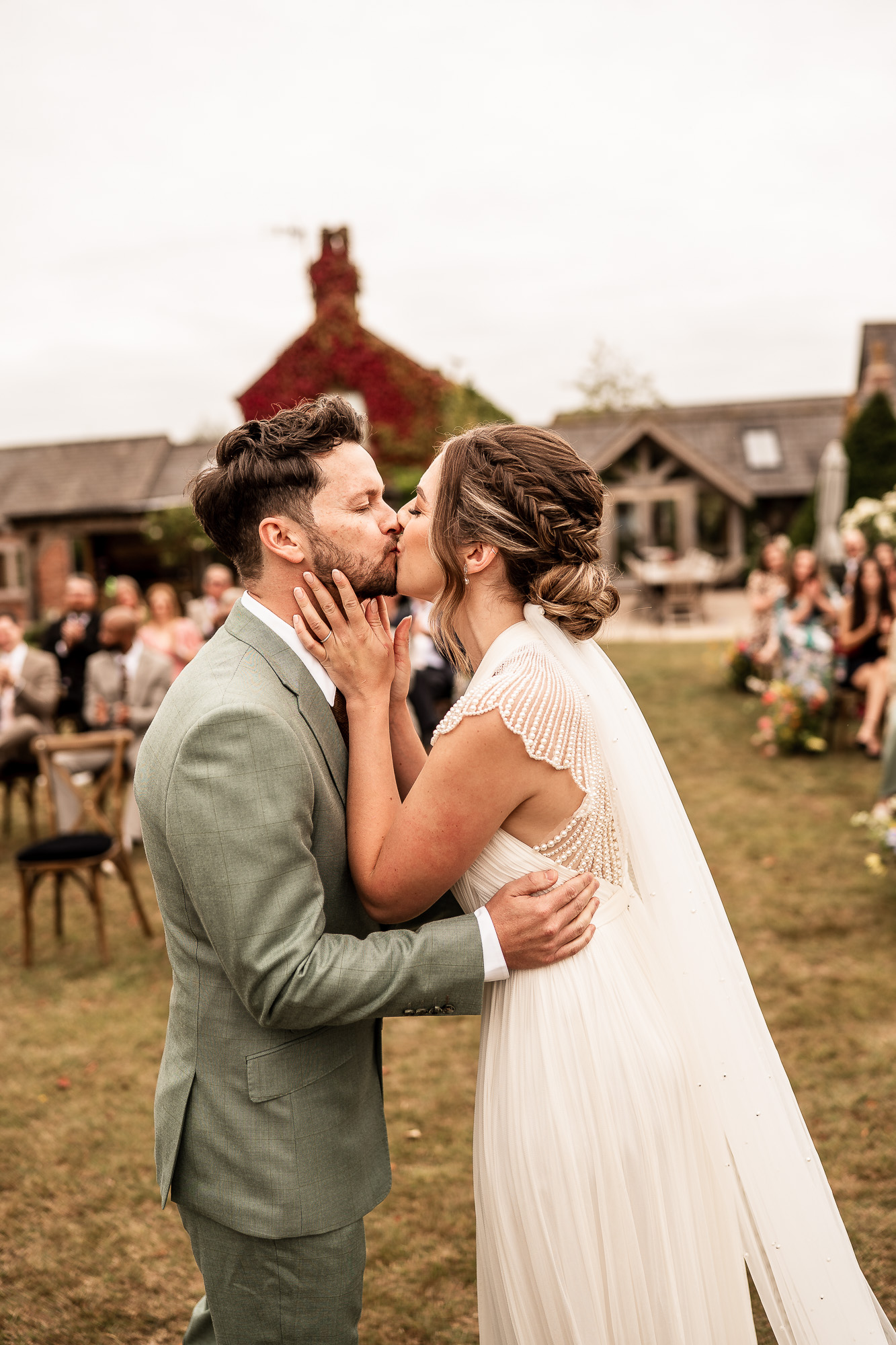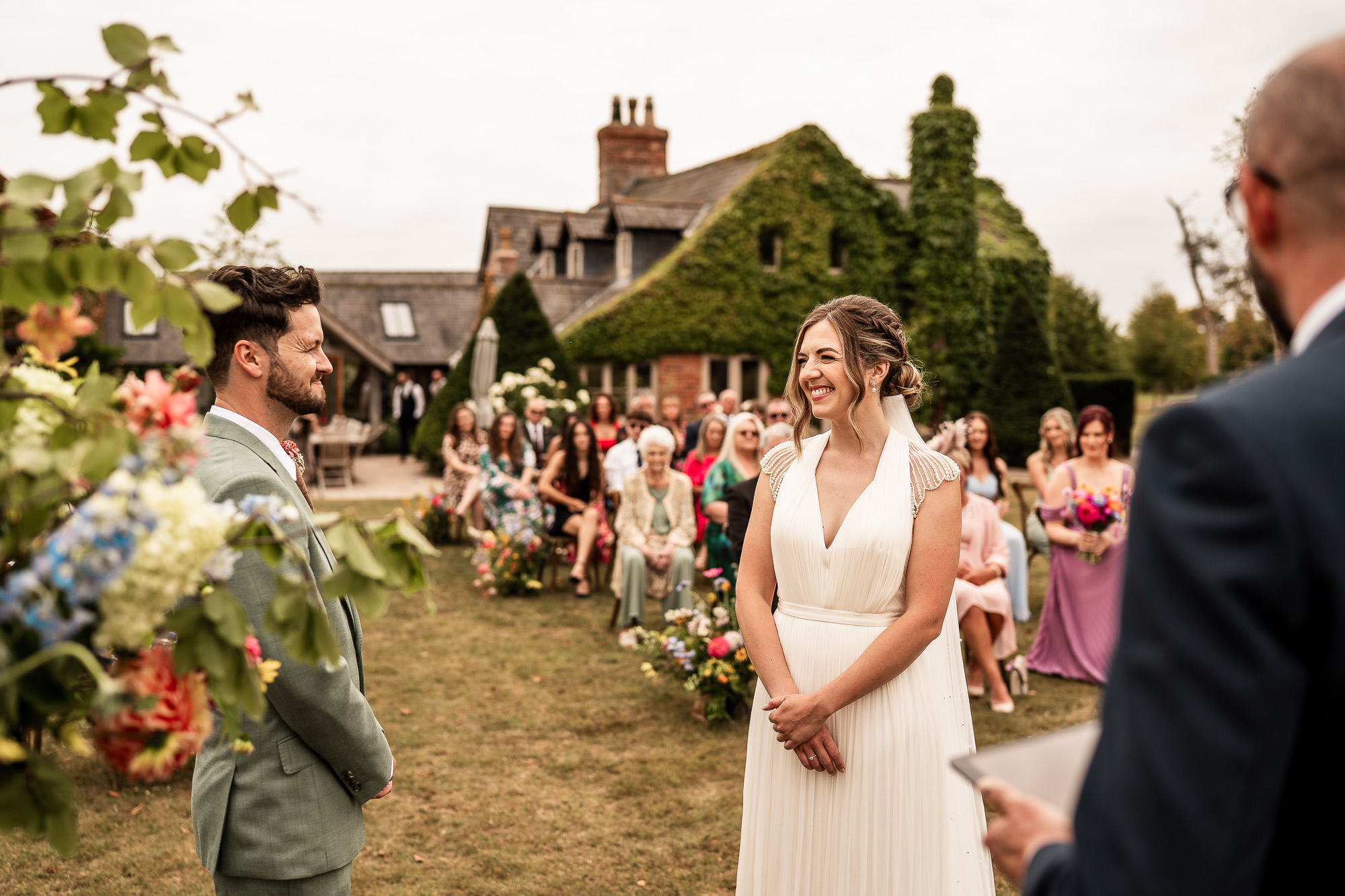 One of the things I love most about an outdoor wedding ceremony at Scarlet Hall is the setting. The five-acre lawn stretches out in front of the manor, framed by English meadow, orchard trees and sculpted topiary. From a documentary wedding photography point of view, it is a dream. Open skies create soft, natural light, and the countryside backdrop gives every image a sense of space, romance and atmosphere without ever feeling staged.