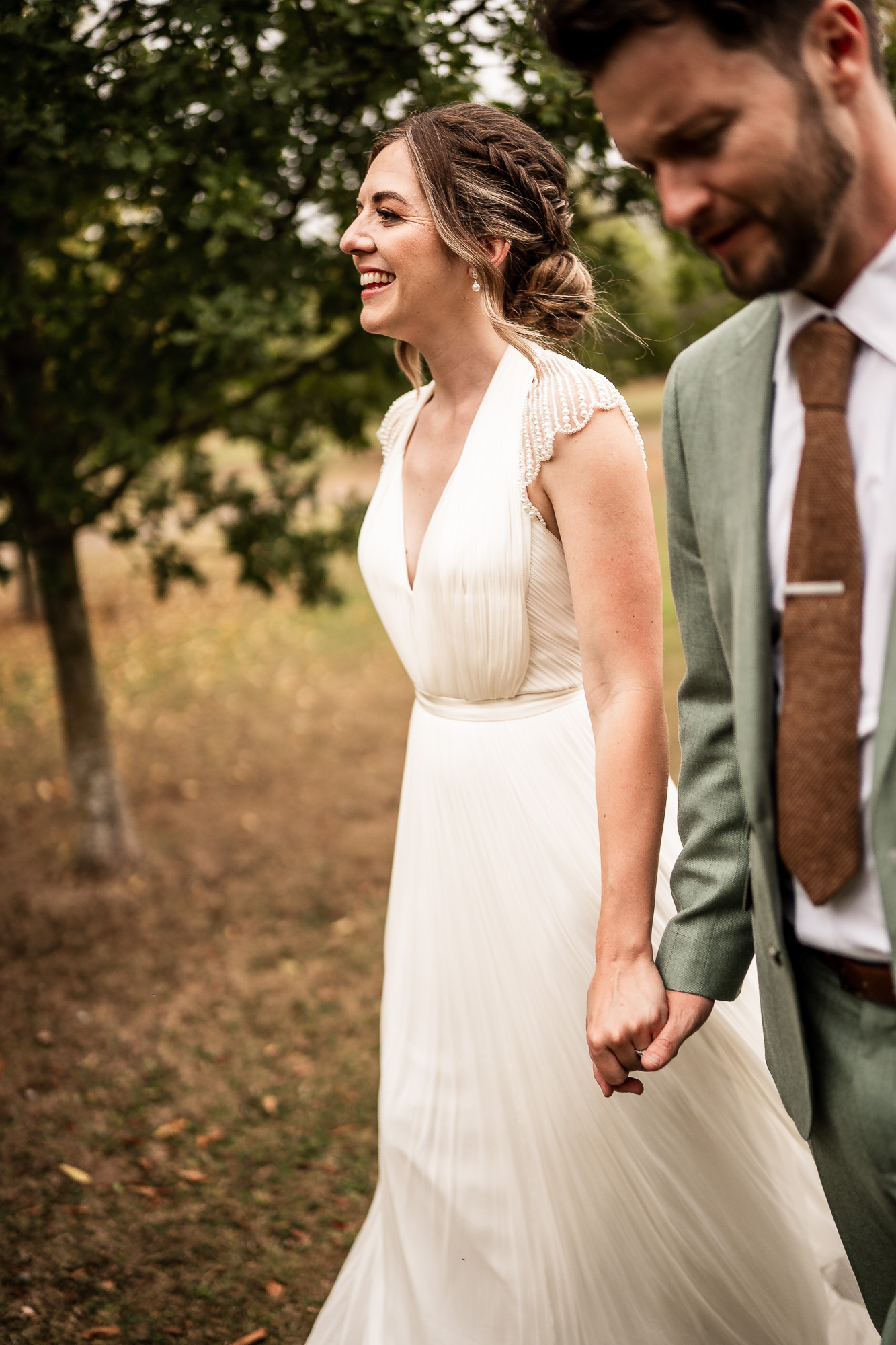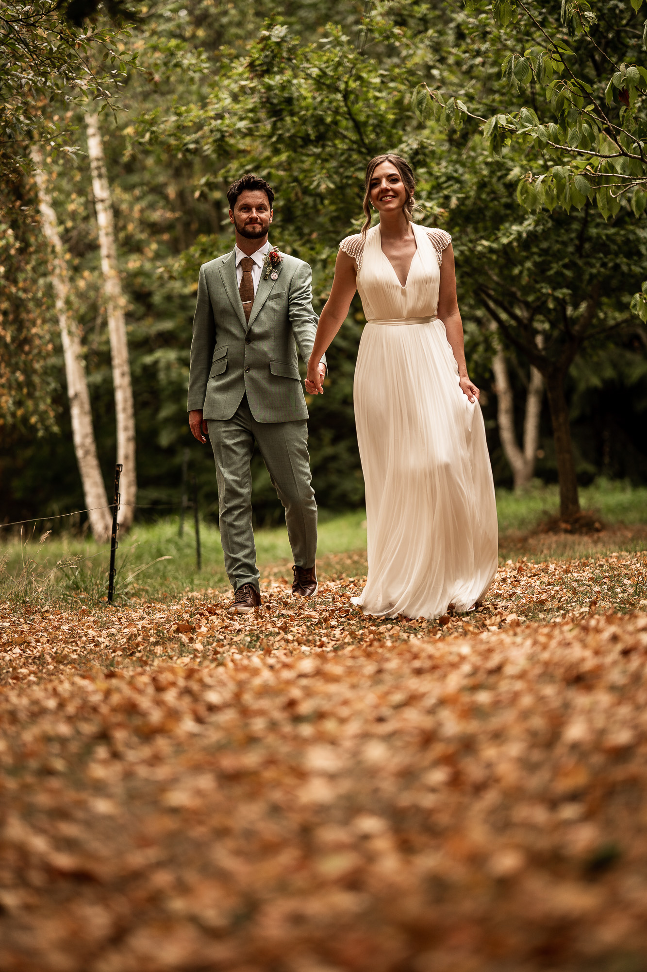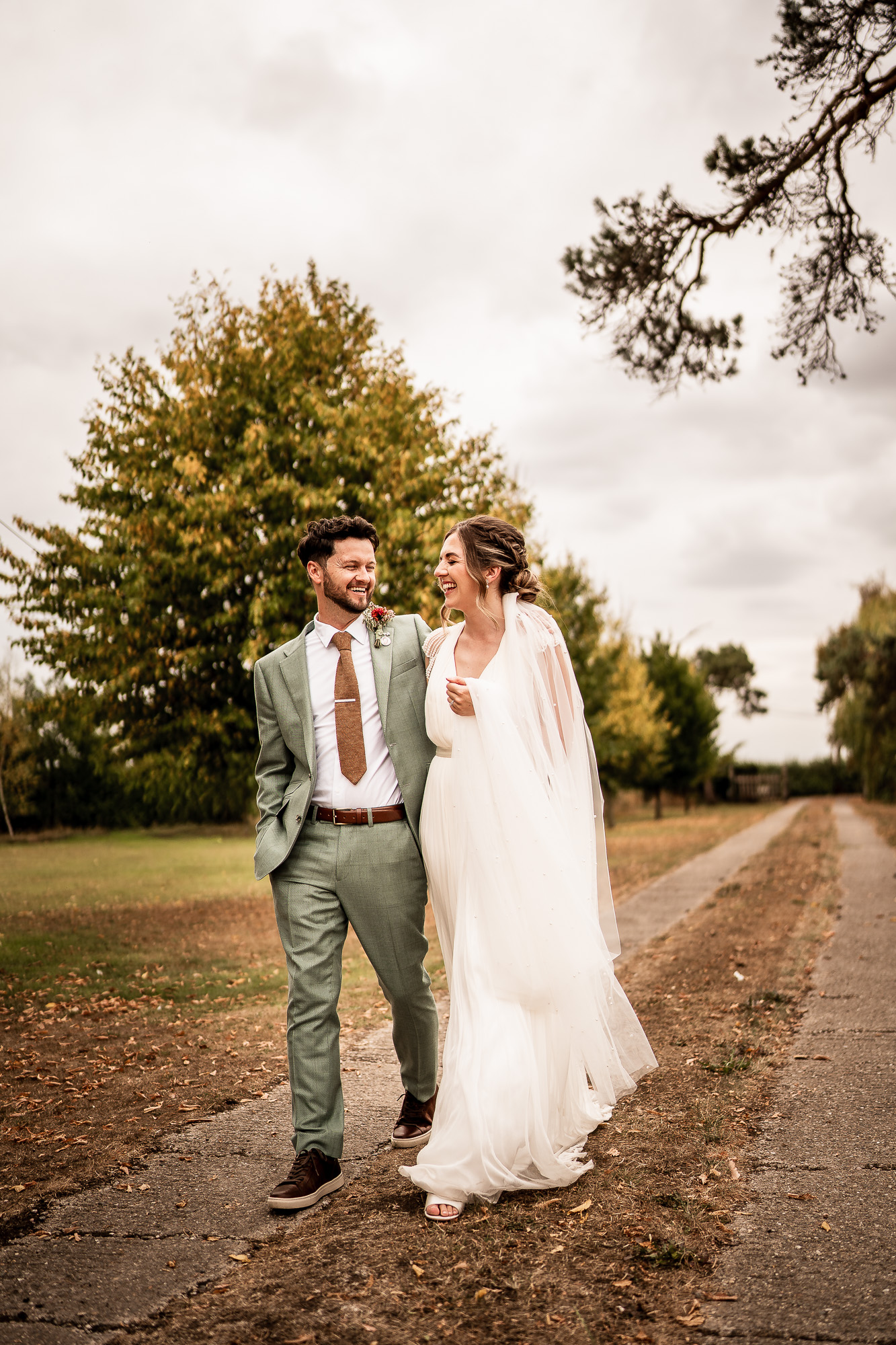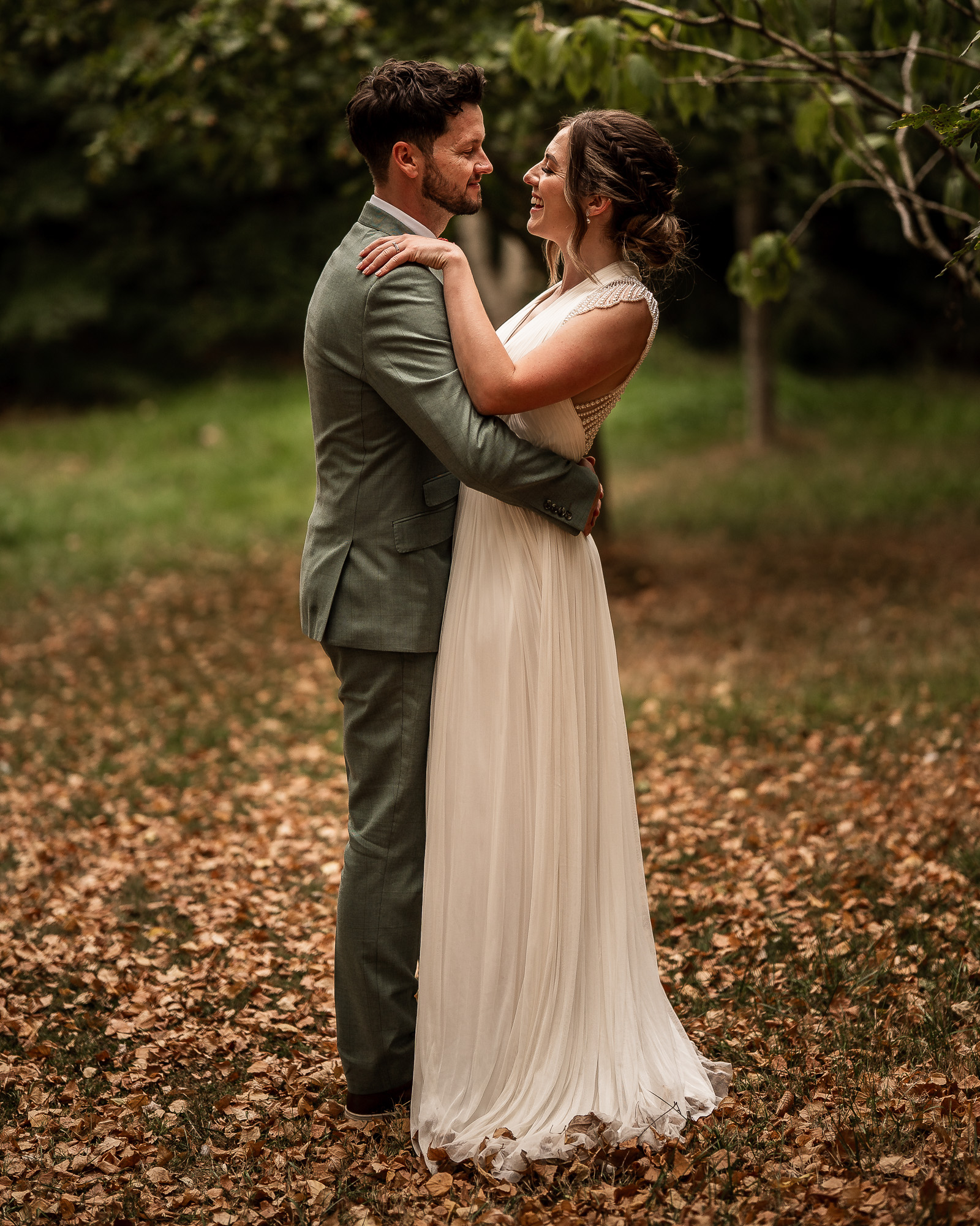This is my favourite kind of couple portrait session. Unhurried, natural and led by how the couple are feeling. No rigid posing, just gentle direction and space to move and laugh. As we wandered past the orchard and across the five-acre lawn, we found some beautiful light filtering through the trees, creating a soft, cinematic glow that works perfectly for relaxed, editorial-style wedding portraits.