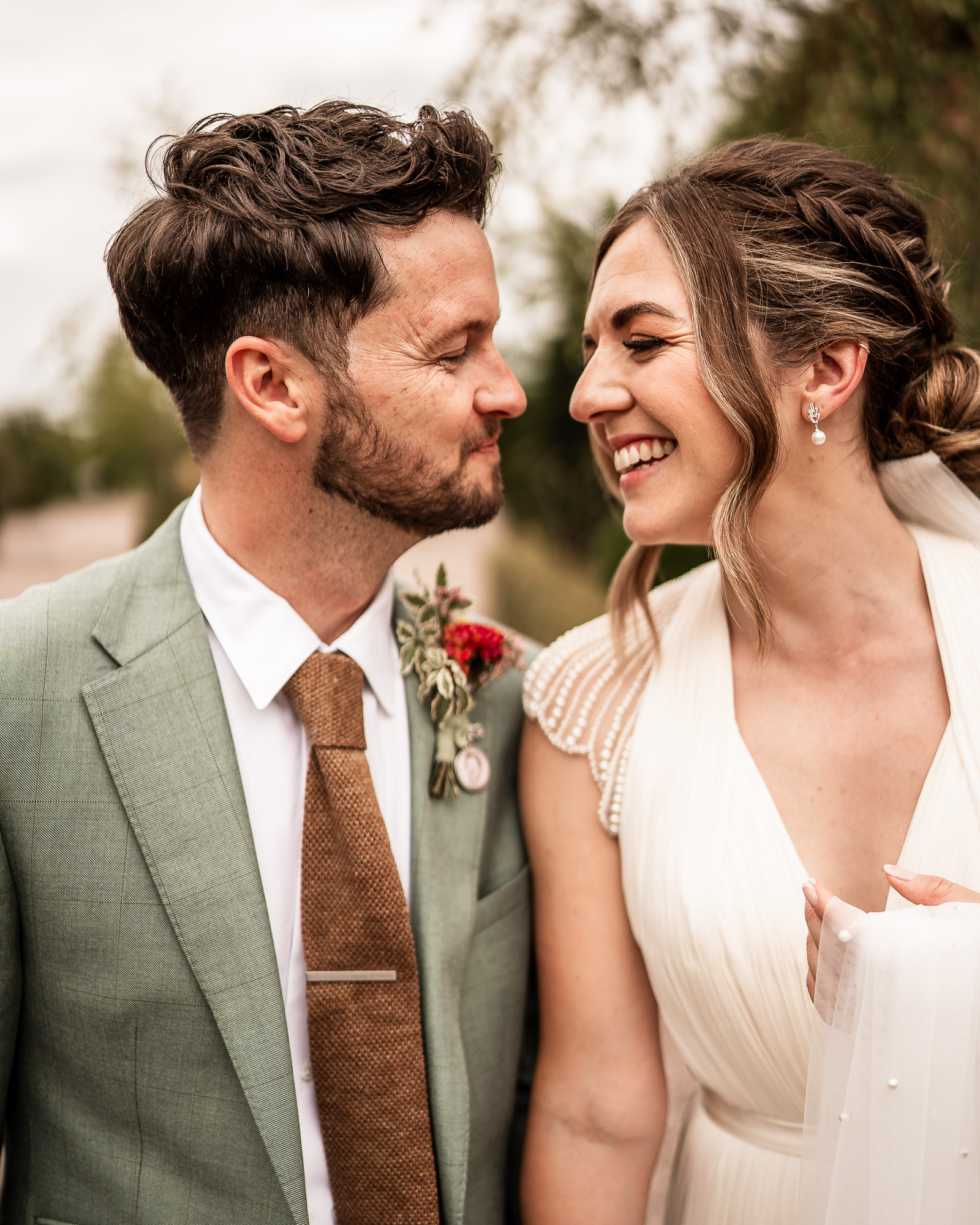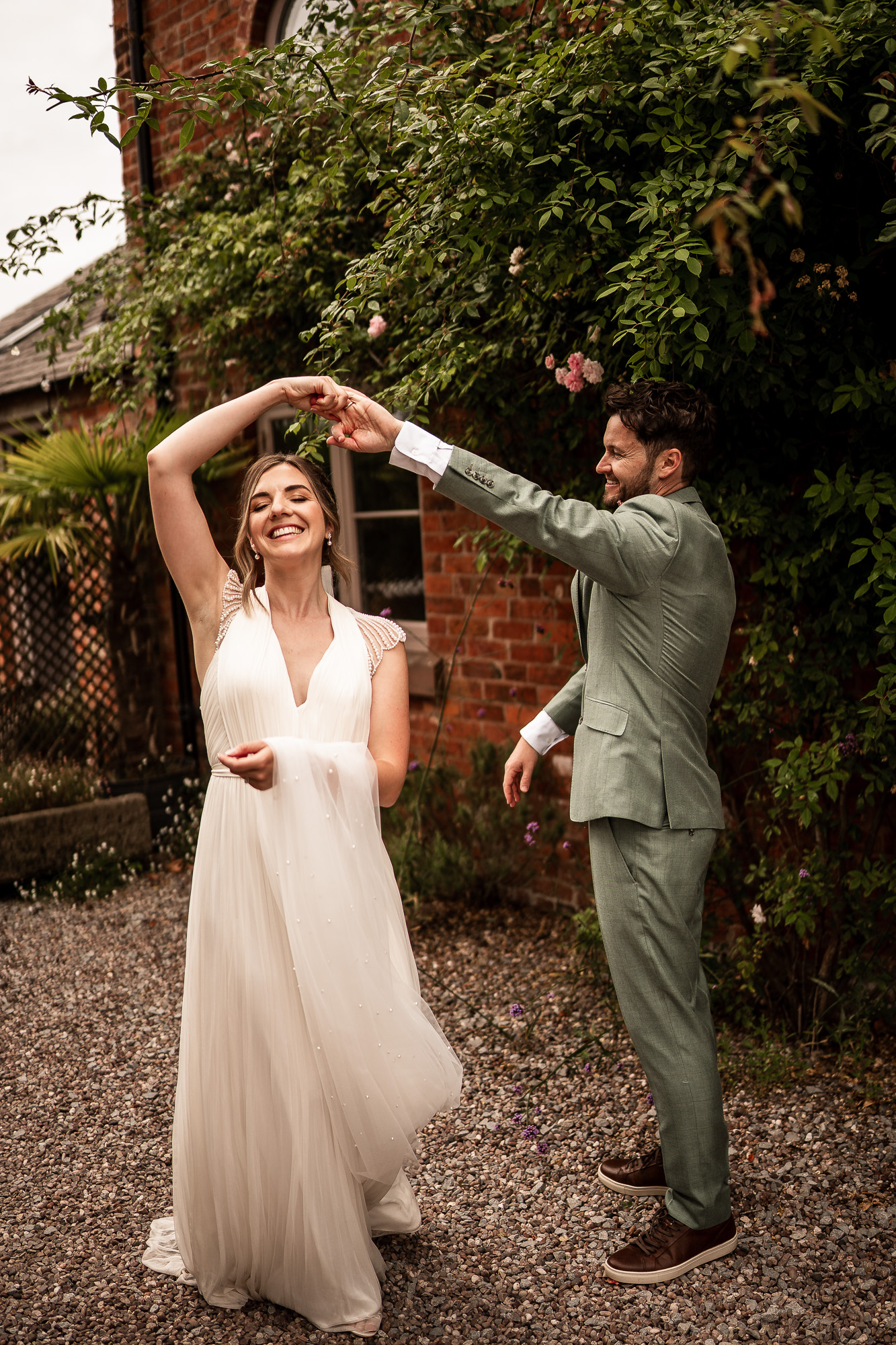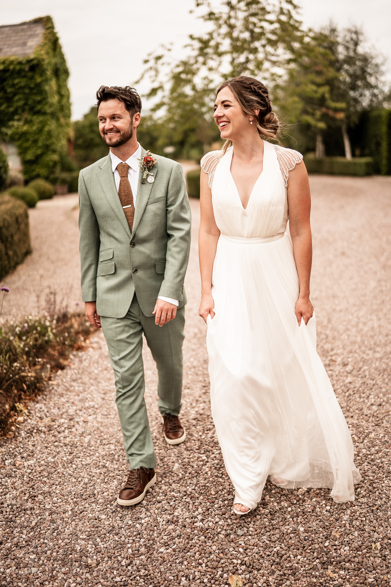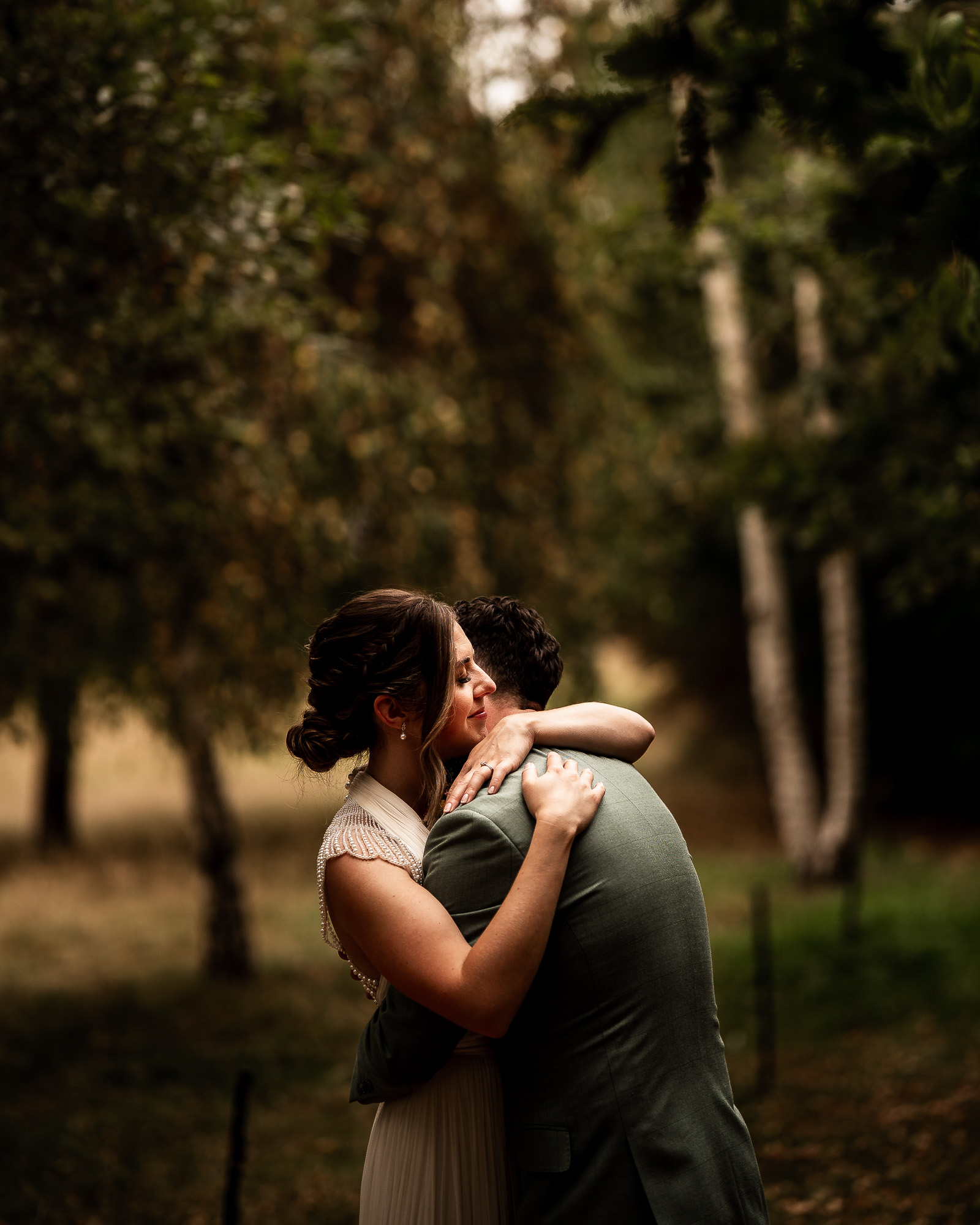 This is my favourite kind of couple portrait session. Unhurried, natural and led by how the couple are feeling. No rigid posing, just gentle direction and space to move and laugh. As we wandered past the orchard and across the five-acre lawn, we found some beautiful light filtering through the trees, creating a soft, cinematic glow that works perfectly for relaxed, editorial-style wedding portraits.