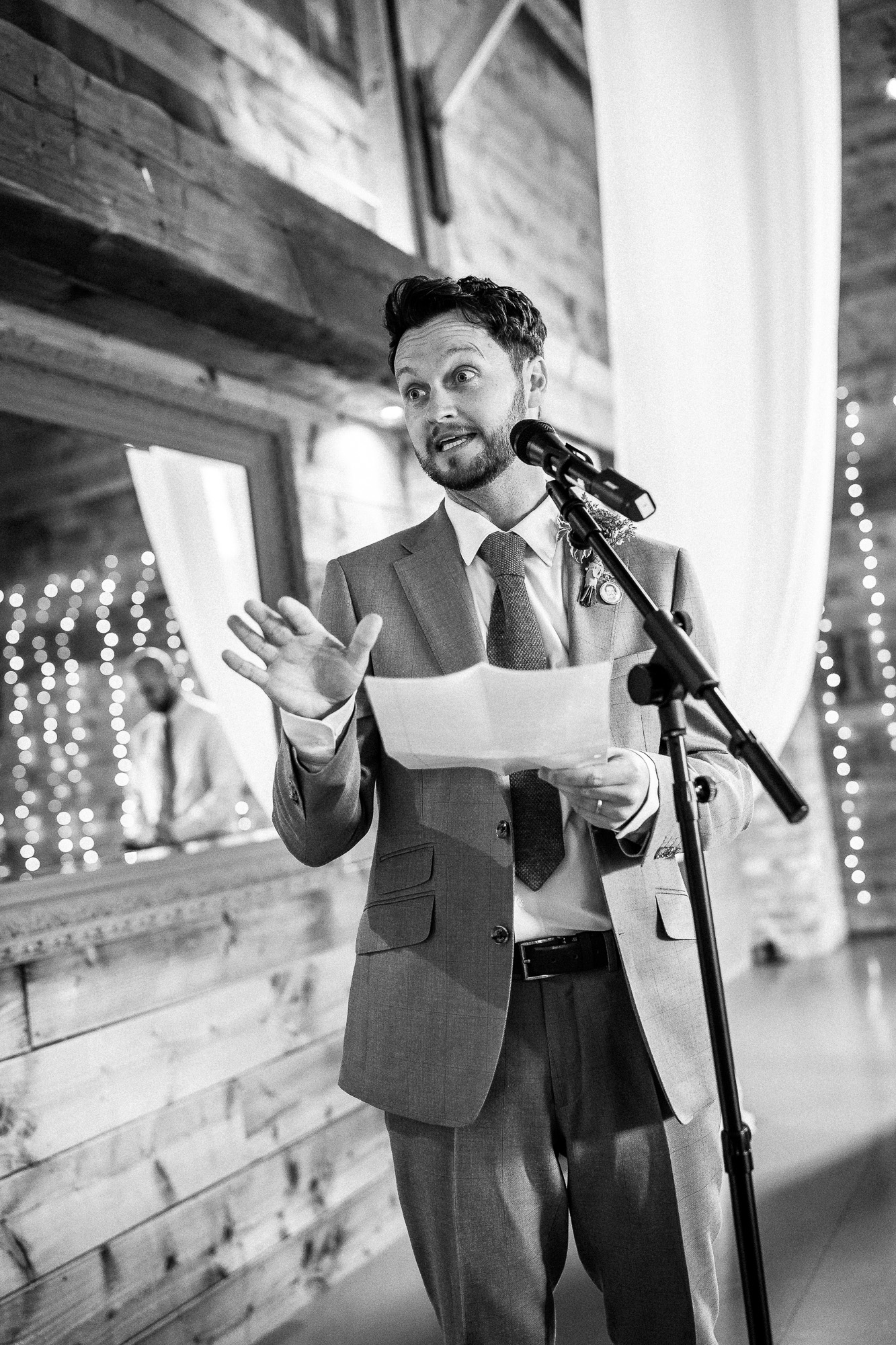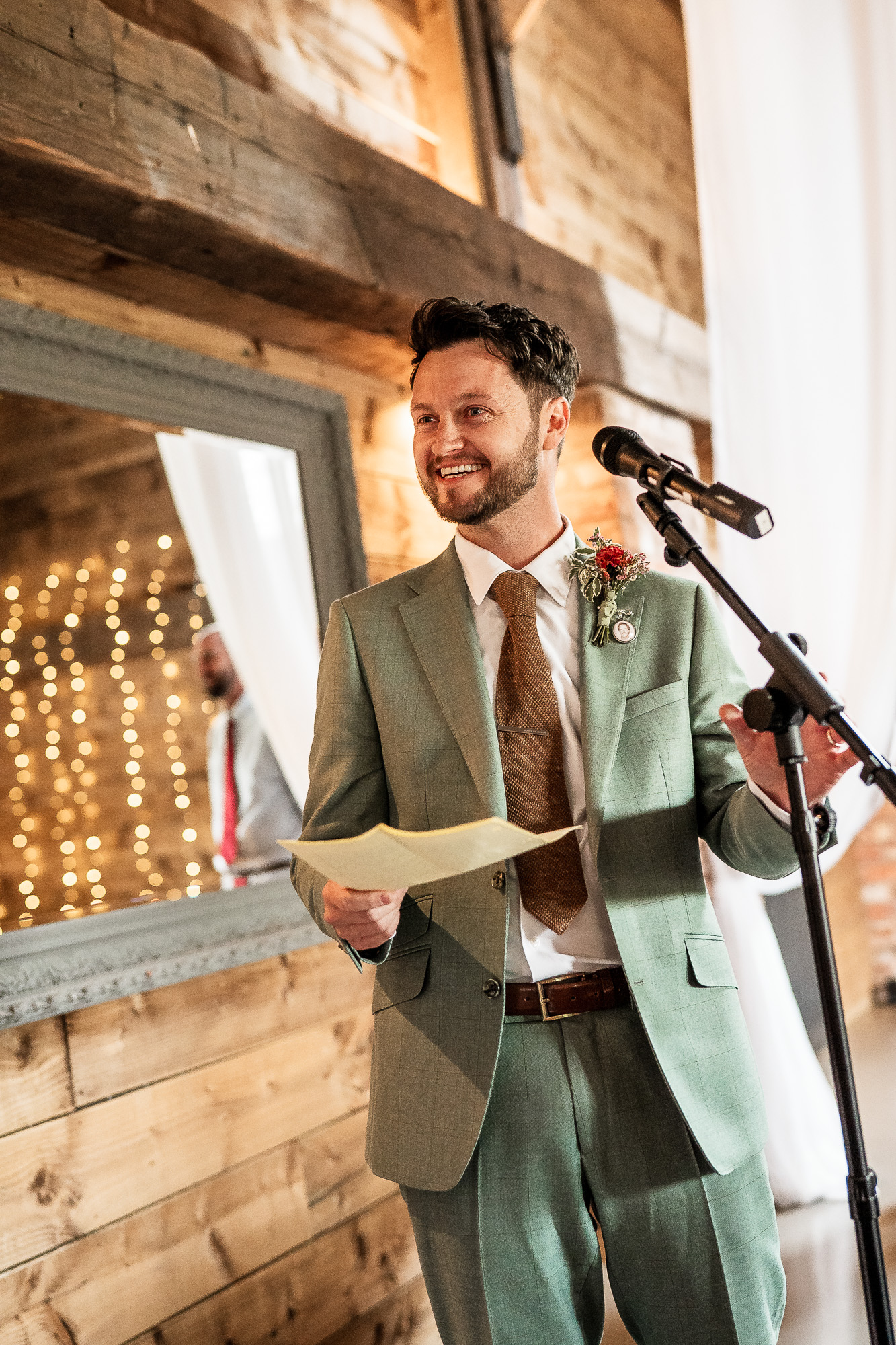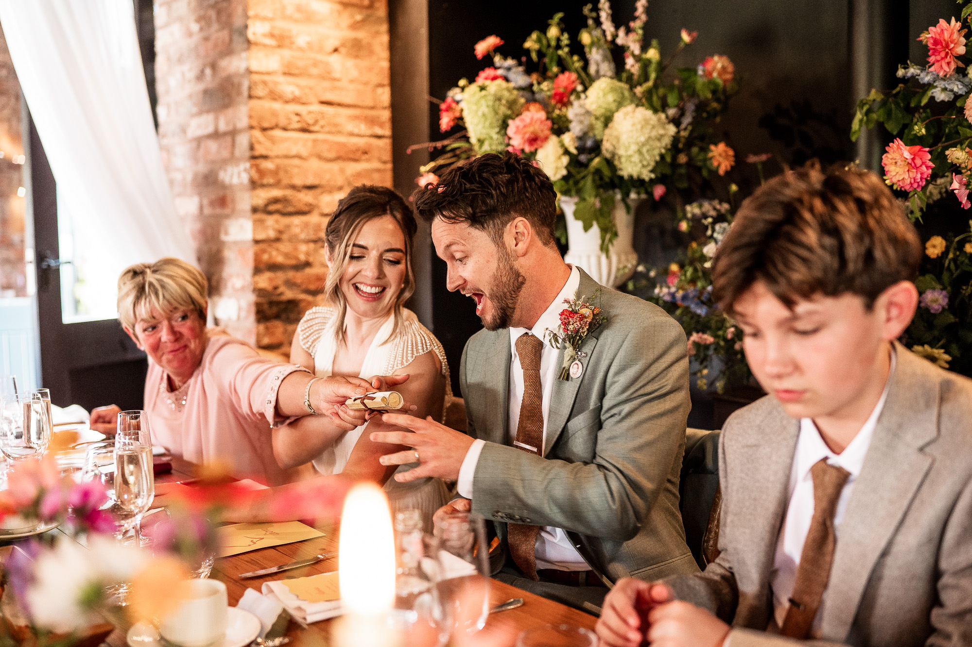 The top table at Scarlet Hall was perfectly positioned to take advantage of the soft, natural light flowing in through the large doors of the barn, a genuine sweet spot that photographers quietly get excited about. It was flattering, directional light that beautifully highlighted expressions during the wedding breakfast. As the guest tables extended further back into the barn and the light naturally dropped away, I switched to a subtle touch of flash on one camera, ensuring I could capture guests’ reactions clearly while preserving the warm, ambient atmosphere.