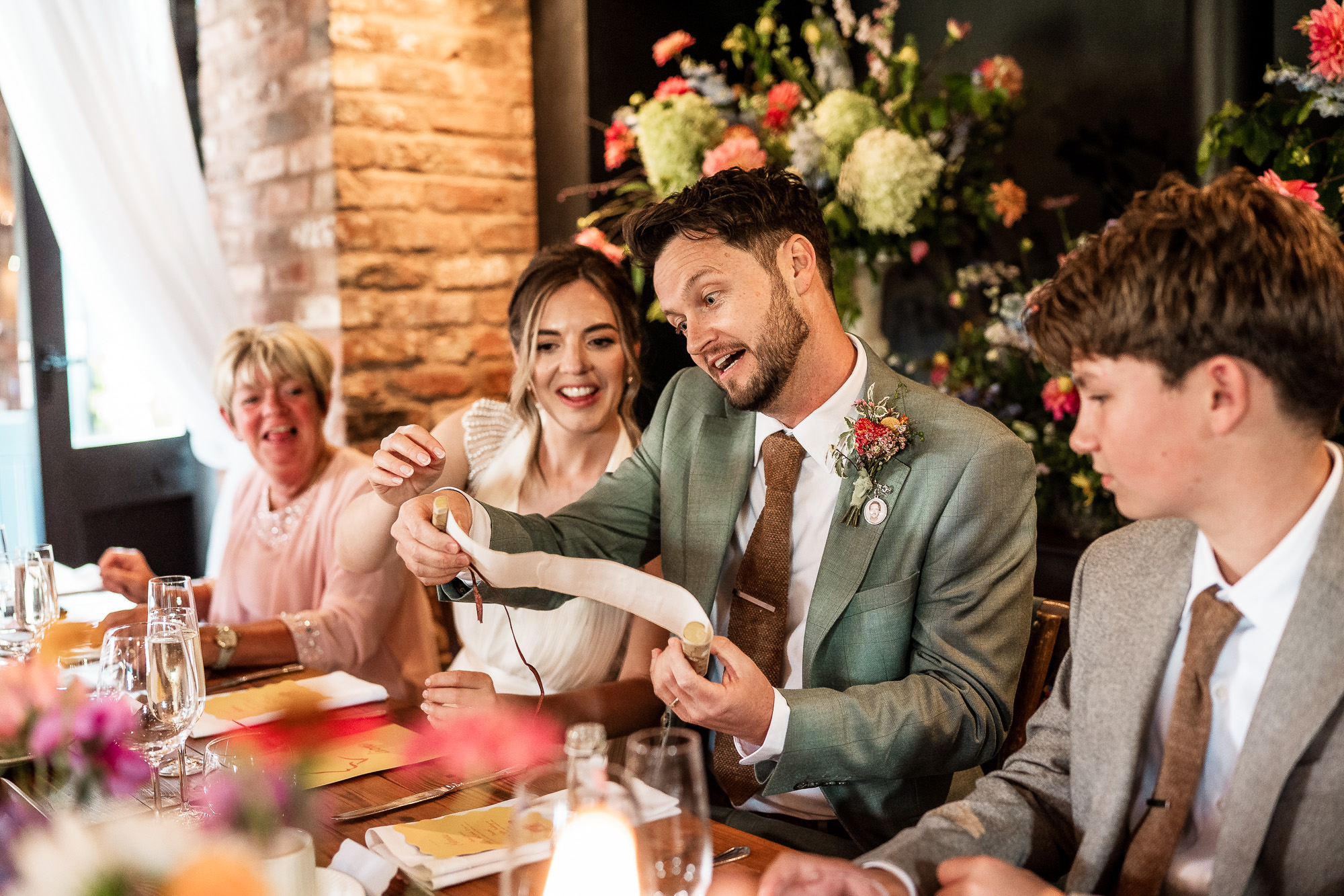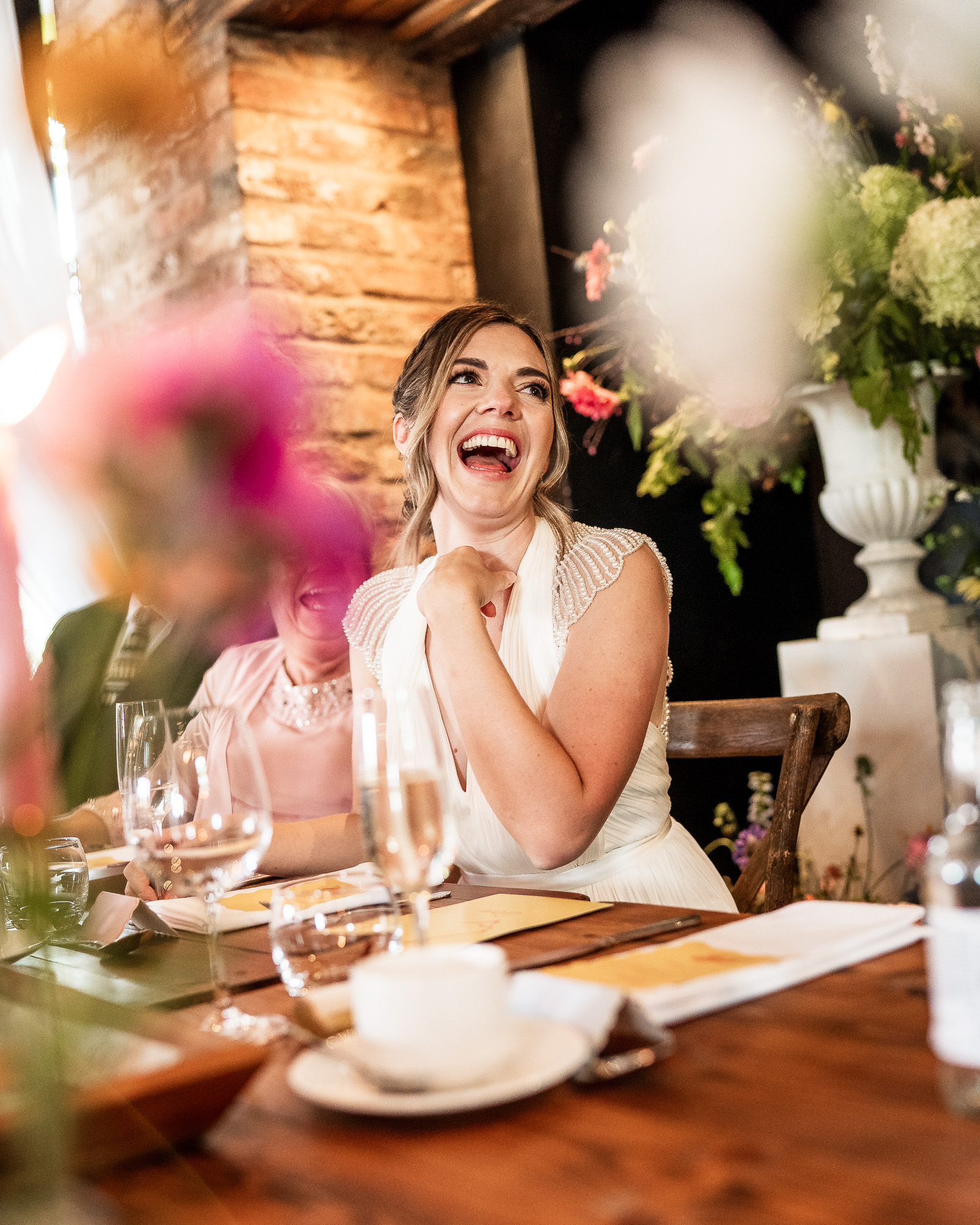 The newlyweds were welcomed into the wedding breakfast to a wall of cheers and applause, immediately setting the tone for a brilliant round of speeches. With everyone seated, glasses charged and anticipation building, the room felt relaxed but full of energy.