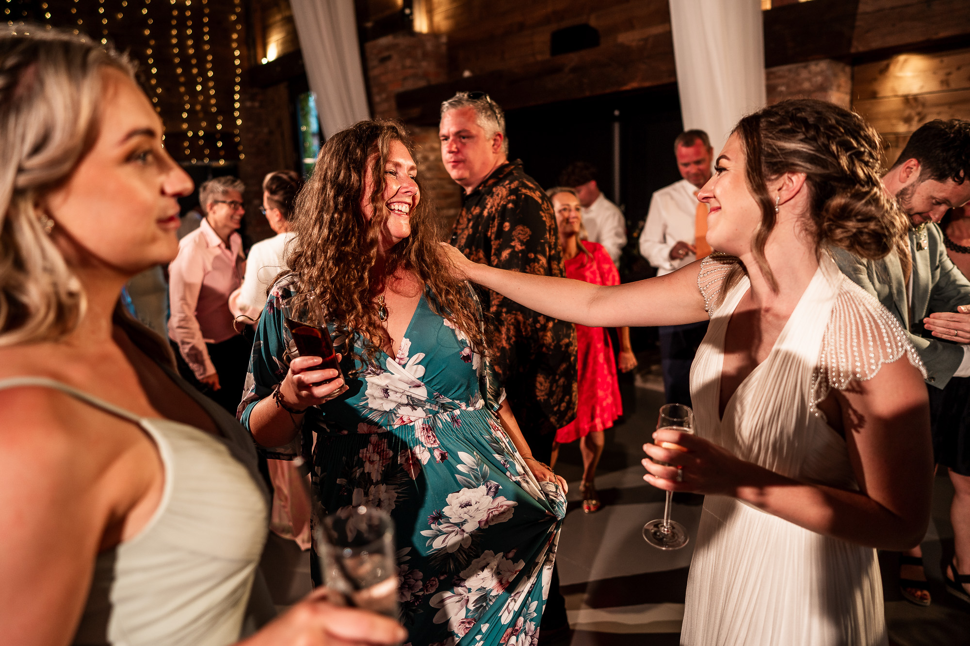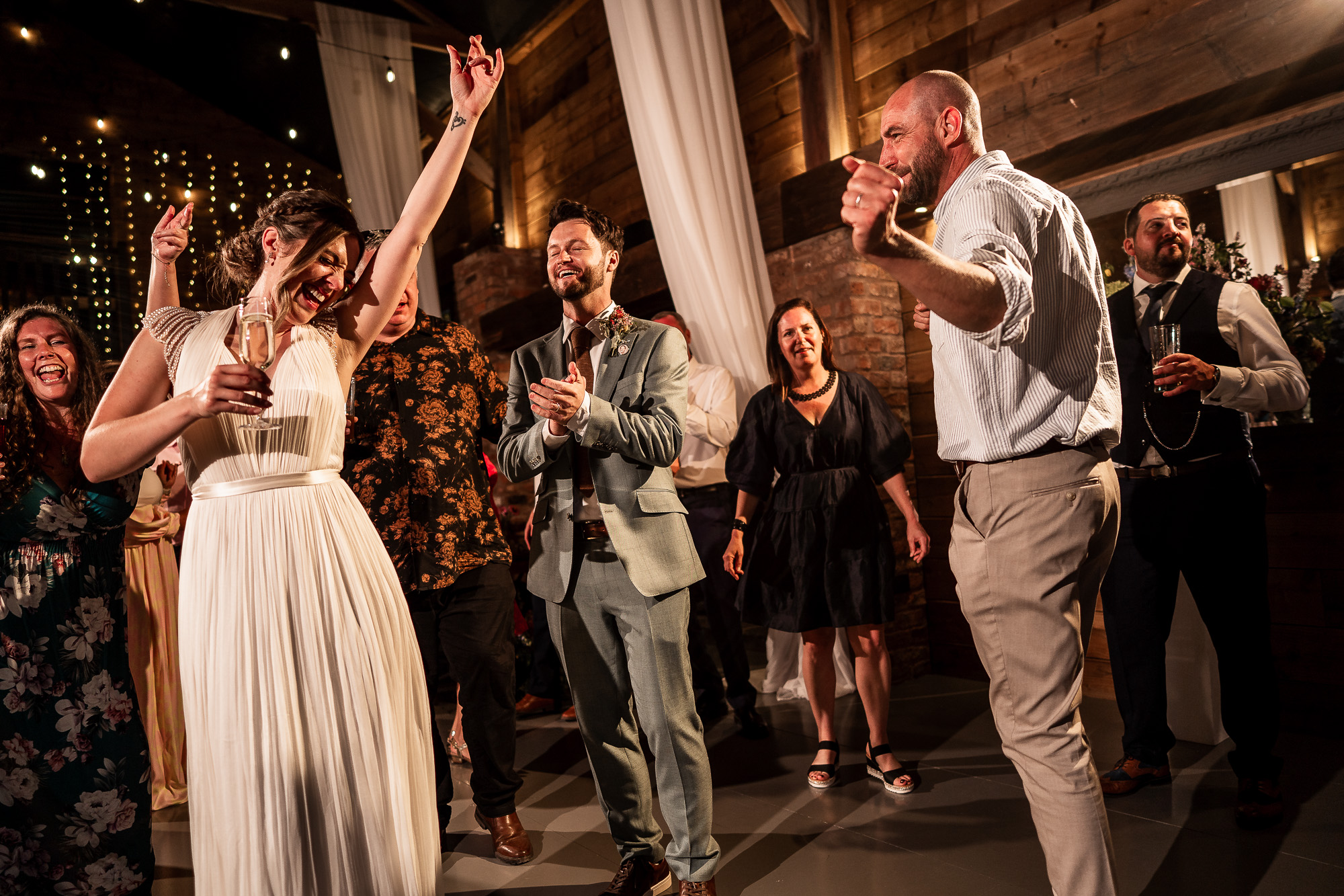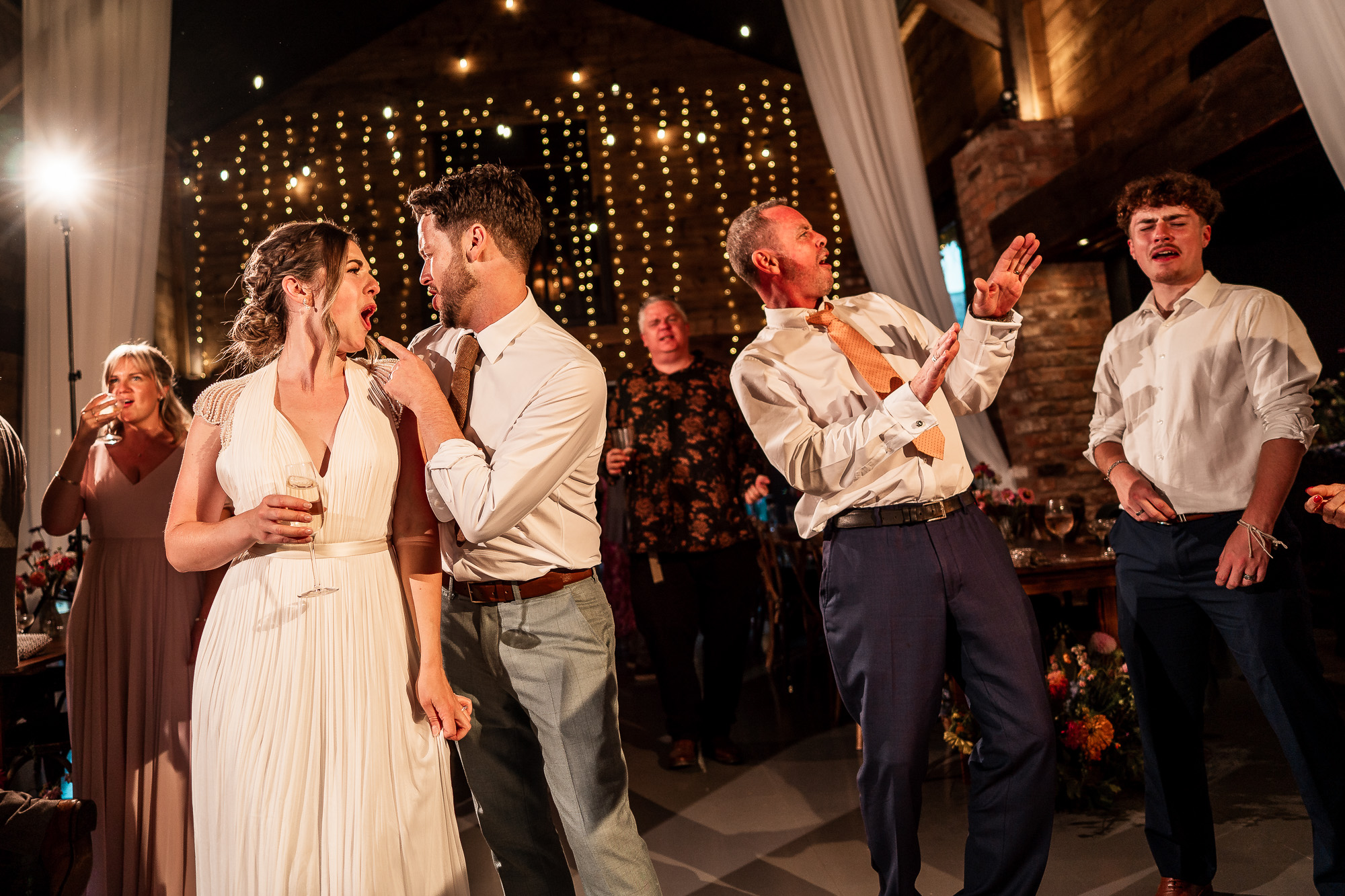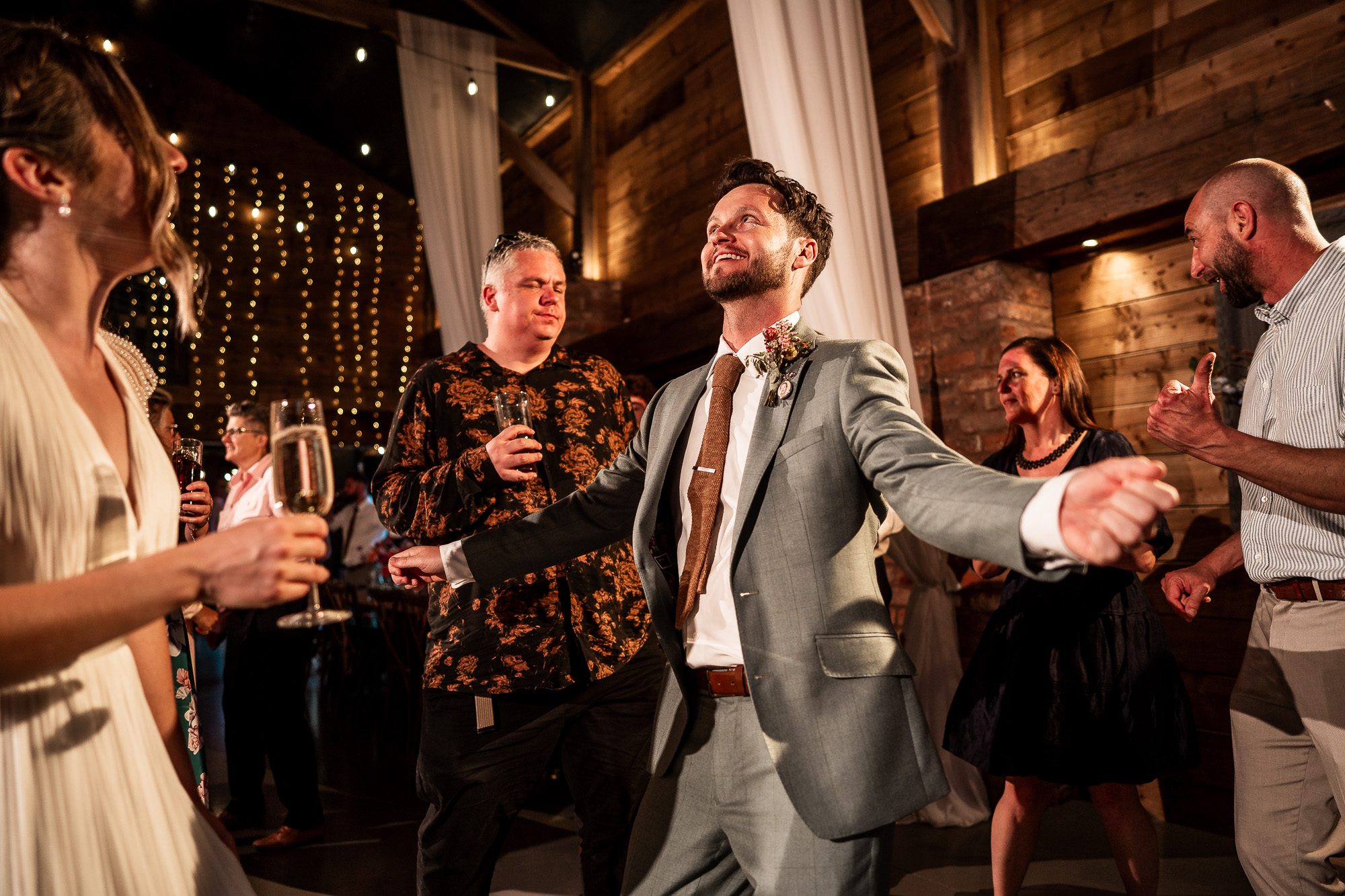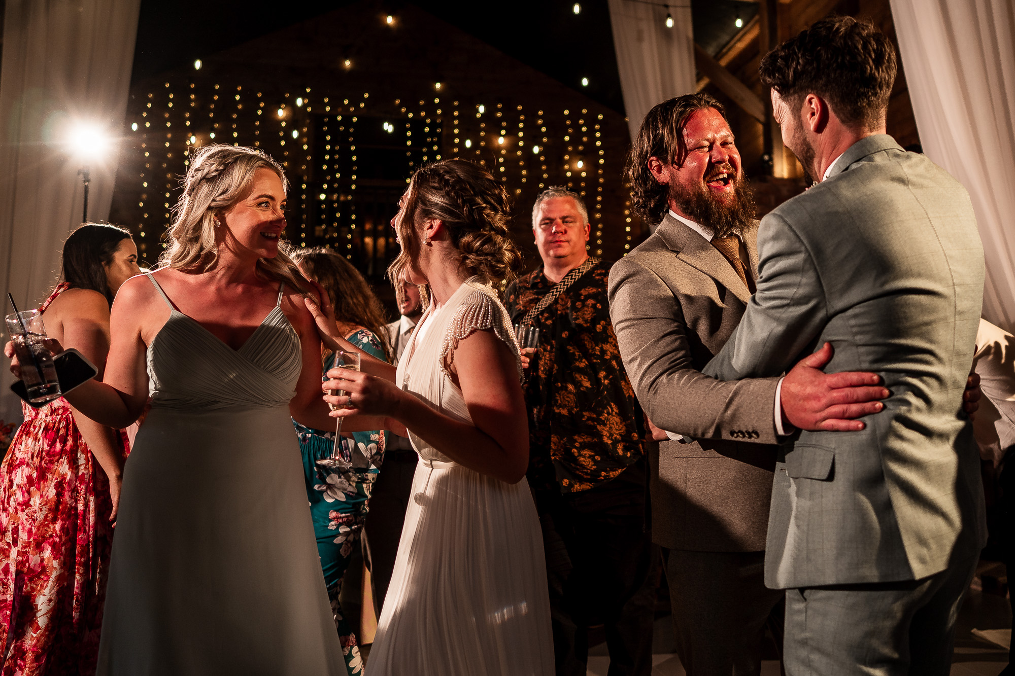 From a documentary wedding photography perspective, the evening reception is pure energy. Movement, laughter, spinning dresses, hands in the air, and those uninhibited moments that only happen once the formalities are done. Capturing that atmosphere at Scarlet Hall, with the barn lit warmly and the countryside darkness just beyond the doors, is always an absolute joy.